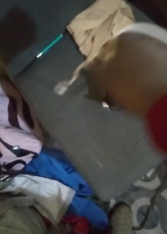 A video shows a black and white cat lying on a grey surface. A white charging cable is dangled in front of the cat. The cat looks towards the cable. There is clothing piled on the left side of the grey surface. A beige shirt is on the top right side of the surface. The person filming is wearing a red long-sleeved shirt. The floor is patterned with grey and white. The lighting is low.