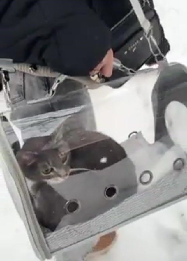 A woman walks through the snow carrying a cat in a transparent carrier