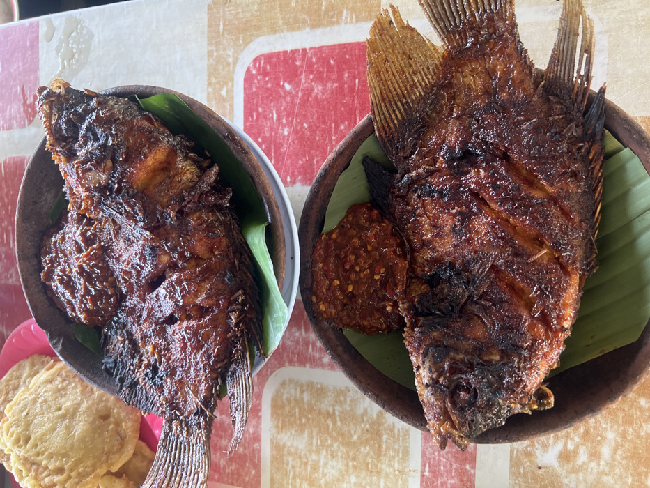 - "The image displays two whole, dark brown, cooked fish presented on a table surface in Gembong, Indonesia" by FM-8Gudz1, licensed under CC BY 4.0