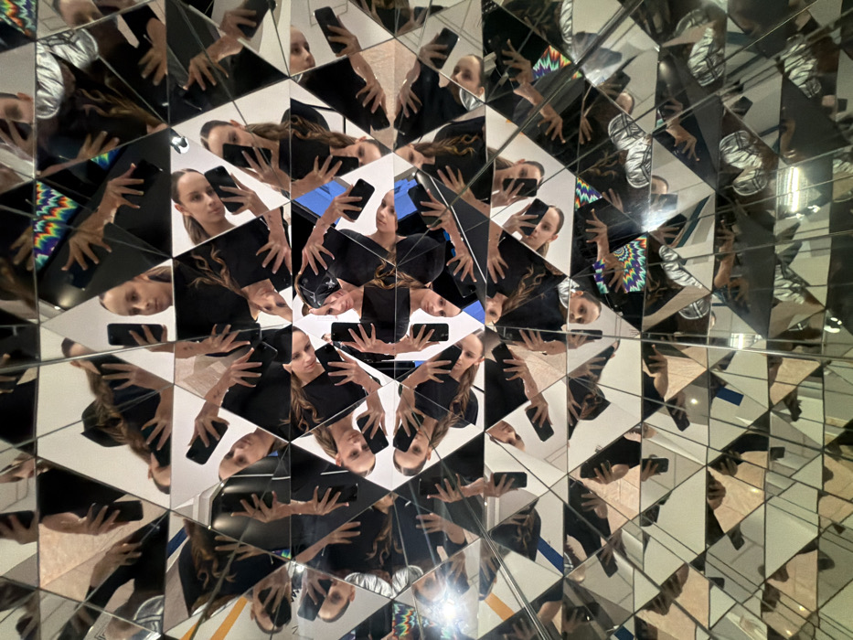The image displays a complex, kaleidoscopic scene composed of numerous triangular mirror facets reflecting a young adult female