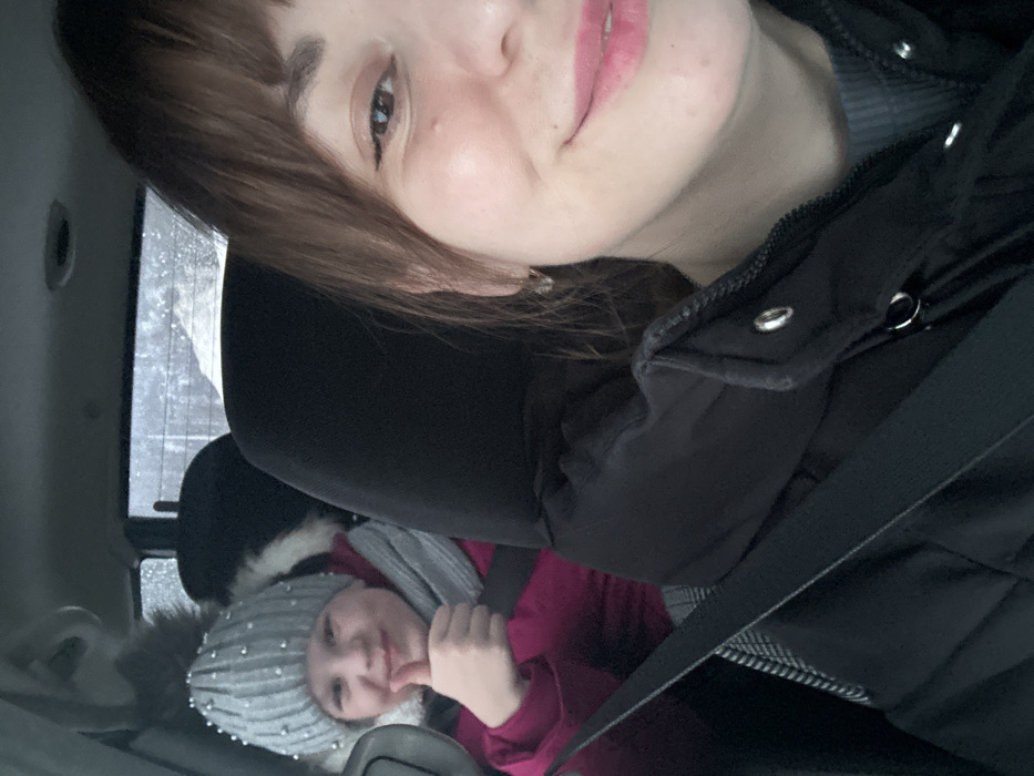 The image displays the interior of a vehicle during daylight, featuring two individuals. In the foreground, on the right, a woman with brown hair and bangs smiles, capturing a selfie. She wears a dark, padded winter jacket over a grey ribbed top, secured by a seatbelt. In the background, on the left, a young girl with a cheerful expression gives a thumbs-up with her right hand. She is dressed in a grey knitted beanie with silver embellishments and a pom-pom, a grey scarf, and a magenta winter jacket, also secured by a seatbelt. Through the vehicle's rear window, a snow-covered landscape is visible, indicating cold weather. The specific location within Zhigalki, Russia, is not discernible from the image.