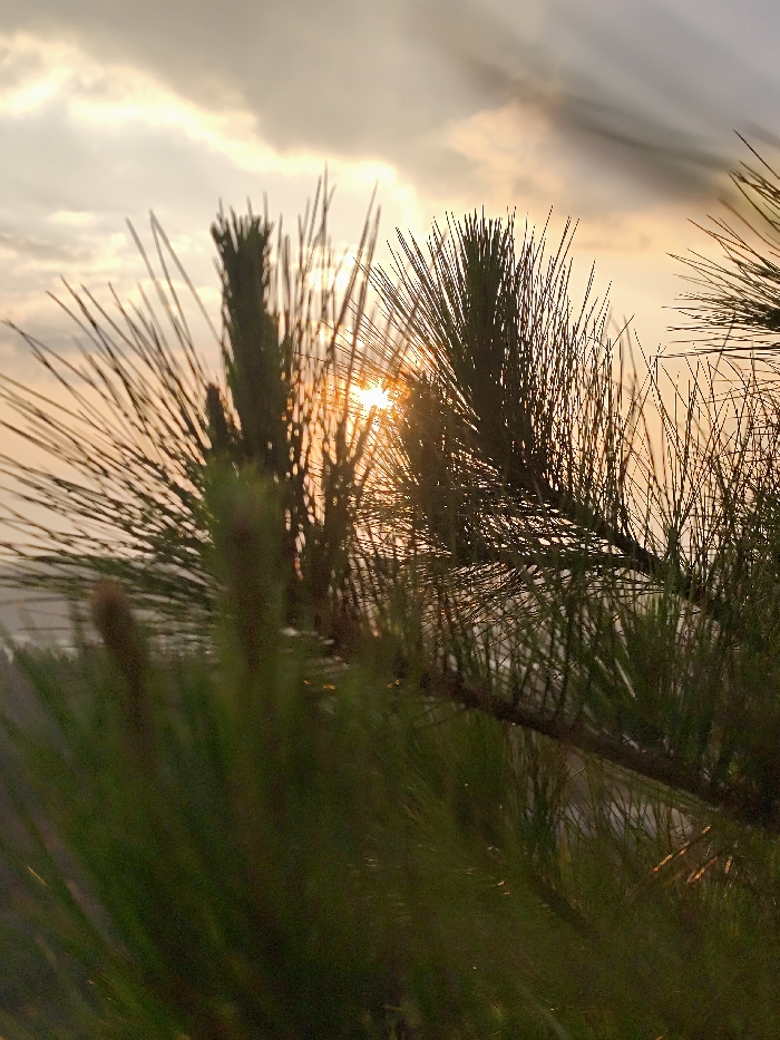 This image depicts a natural outdoor scene in Lạc Dương, Vietnam, observed during either sunrise or sunset. The primary focus is a dense arrangement of dark green pine needles and branches, prominently silhouetted against a luminous sky. The sun, a bright and intense point of light, is visible in the upper-middle-left quadrant, partially obscured by the pine needles, which creates a noticeable sunburst effect. The sky transitions from soft orange-yellow tones near the horizon to lighter grays and whites, featuring visible cloud formations in the upper section. The immediate foreground contains blurred green pine foliage, while the background beneath the visible horizon line is indistinct and hazy. No human figures, animals, or specific man-made structures are identifiable within the frame.