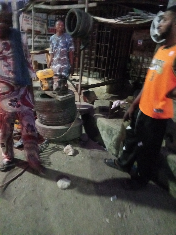 Three men stand amidst stacked tires and equipment in a dimly lit, makeshift garage. One man, centered, wears a patterned blue shirt and stands near a yellow generator. To his left, a second man in patterned pants and a vest is partially visible. The third man, on the right, is dressed in an orange tank top and black pants. The scene suggests a local tire repair shop or roadside service.