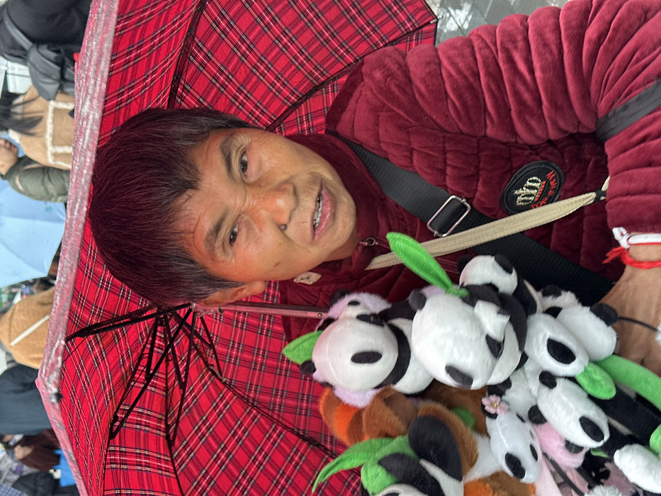 An elderly person wearing a quilted maroon jacket and carrying a shoulder bag stands under a red plaid umbrella. They are surrounded by plush panda toys, each with a green leaf. The individual is smiling at the camera. Background shows the legs and feet of other people, possibly walking nearby, and a glimpse of blue and beige umbrellas.