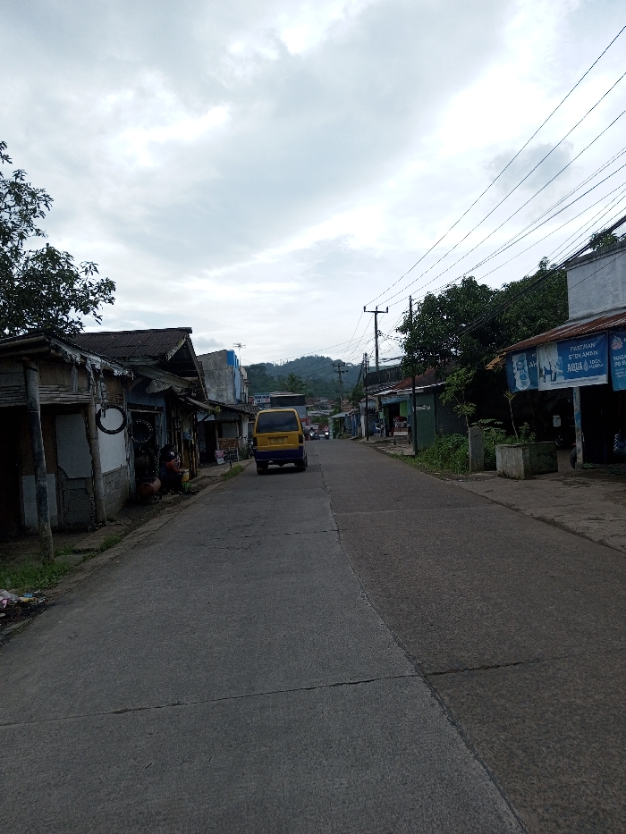 This image presents a street scene in the city of Ariyalai, Sri Lanka, viewed under an overcast sky. The perspective looks down a moderately narrow, paved road that recedes into the distance, curving slightly and ascending towards a range of tree-covered hills. On the left side of the road, in the foreground, stands a small, dilapidated single-story structure featuring a corrugated metal roof and exposed wooden supports. Adjacent to its entrance, at least one individual is seated on the ground, partially obscured. Several circular black objects, possibly tires or bicycle rims, are visible near the building's facade. Lush green foliage and trees overhang the buildings further along this side. The right side of the street is lined with commercial buildings, one prominent structure featuring a large blue and white advertisement sign on its facade. The sign promotes "AQUA" bottled water and includes text such as "PASTIKAN STOK AMAN" (Indonesian for "Ensure Stock is Safe"). A rectangular concrete planter box is situated on the ground in front of this building. Utility poles with multiple interwoven overhead electrical and communication wires run along the right side, extending into the background. Midway down the road, a yellow minivan or utility van with a dark blue rear bumper is visible, moving away from the viewer. Further in the distance, additional smaller vehicles, possibly motorcycles, are discernible. The road surface is dark grey asphalt, displaying visible seams and minor cracks. The sky is uniformly covered with dense, light grey clouds. No direct interactions between individuals are discernible.