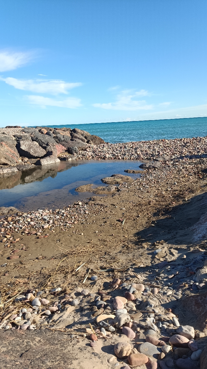 The image captures a coastal landscape in Sagunto, Spain, under a clear, light blue sky with sparse white clouds. The upper third of the frame shows the sky, transitioning to a serene turquoise-blue sea at the horizon, exhibiting minimal wave activity. The midground features a prominent rock formation, appearing as a dark, angular barrier composed of large, irregular stones, likely a breakwater or jetty, extending into the water on the left side of the frame. Adjacent to this structure, a shallow, clear pool of still water reflects the sky, positioned between the rocks and the main beach area. The foreground and immediate midground consist of a beach composed of both light brown sand and a significant distribution of multi-colored pebbles and small stones, ranging from light grey to reddish-brown. Scattered across the sandy sections are visible accumulations of dry, light-colored organic debris, including twigs and what appear to be dried plant stems. Long, dark shadows are cast across the sandy substrate in the lower right, indicating a low sun angle. No individuals, animals, or active subjects are present within the scene.