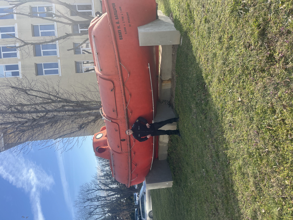 The image displays a male individual standing in front of a large, red, fully enclosed lifeboat positioned on a grassy lawn under a clear blue sky with scattered clouds. The scene is located at the Nikola Vaptsarov Naval Academy in Varna, Bulgaria, as indicated by the Cyrillic inscription "ВВМУ Н. Й. ВАПЦАРОВ" on the starboard side of the lifeboat. Additional text on the lifeboat specifies its dimensions as "9.00M x 2.70M x 3.00M" and its capacity as "30 PERSONS." The male subject, positioned in the lower-left portion of the frame, faces the camera directly. He is wearing a dark, possibly uniform-style, jacket and trousers, with his hands placed on his hips. The lifeboat, the primary foreground object, is a distinct bright red-orange and is elevated on two light-colored concrete bases. Behind the lifeboat, a multi-story building with a light-colored facade and multiple rectangular windows is visible. Several bare deciduous trees stand between the lifeboat and the building, as well as along the left periphery of the scene. In the far left background, several parked vehicles are identifiable on what appears to be a paved area or roadway. The ground in the foreground consists of green grass with some visible dry patches. Two small avian figures are discernible in flight against the sky in the upper-left corner. The lighting suggests a sunny day, casting shadows from the lifeboat and the subject onto the grass.