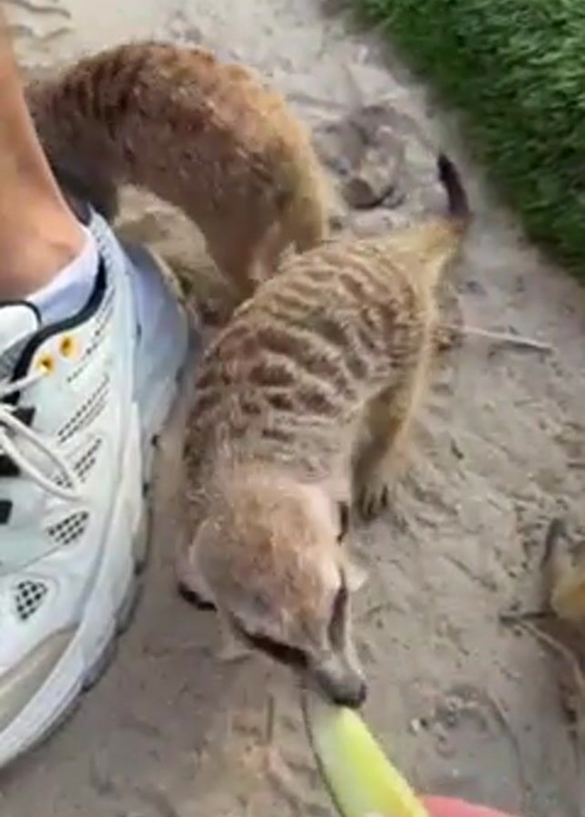 person feeding a group of meerkats a piece of celery. The meerkats are small, brown mammals with striped backs. They are standing on sand and have their front paws on the ground. The person is holding a piece of celery in their hand and feeding it to the meerkats. The meerkats eat the celery quickly. One of the meerkats goes up to the person's white sneaker. The background is mostly sand with a patch of artificial green grass to the side. The video is filmed at eye-level, and the meerkats are the main focus.