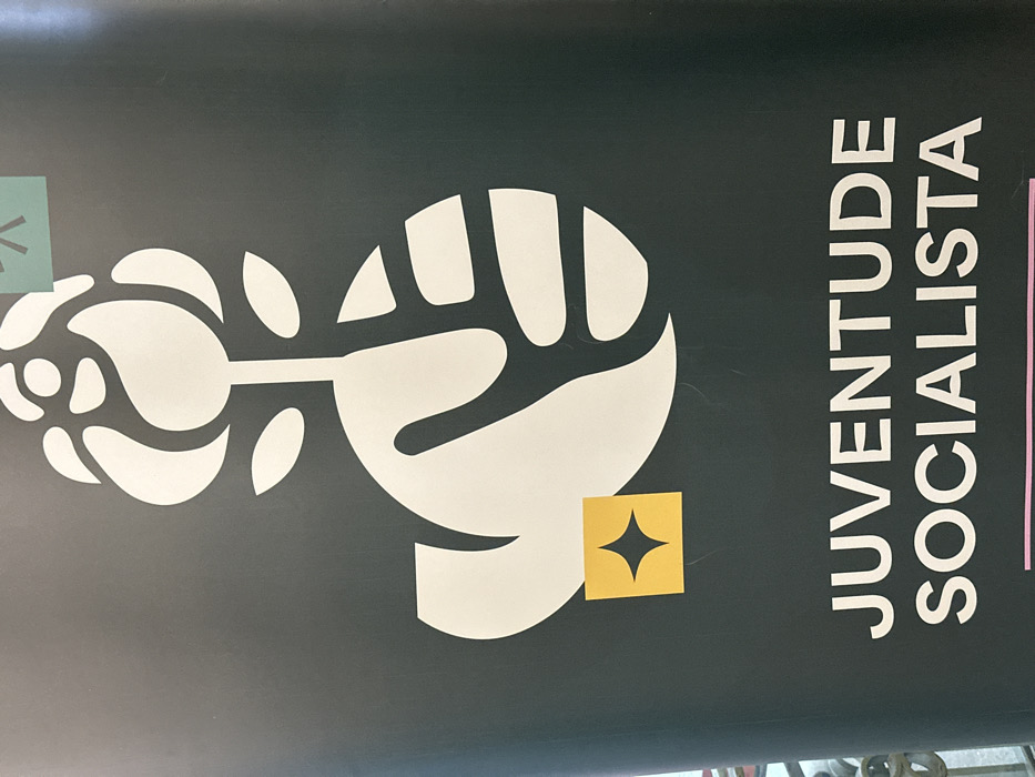 The image displays a vertical dark-colored banner, likely dark green, featuring white graphics and text. The upper portion of the banner presents a stylized white logo depicting a rose atop a stem, which is grasped at its base by a white hand. Below this logo, the words "JUVENTUDE SOCIALISTA" are printed in white uppercase letters. A small light-green rectangular sticker with a white asterisk-like symbol is affixed to the banner's upper right corner. Additionally, a small yellow square sticker with a black four-pointed star is placed over the lower-left section of the white hand logo. Minor surface imperfections and creases are visible on the banner. A portion of a dark, ornate metal structure, possibly a railing, is visible along the bottom left edge of the frame. The banner is located within the city of Aveiro, Portugal.