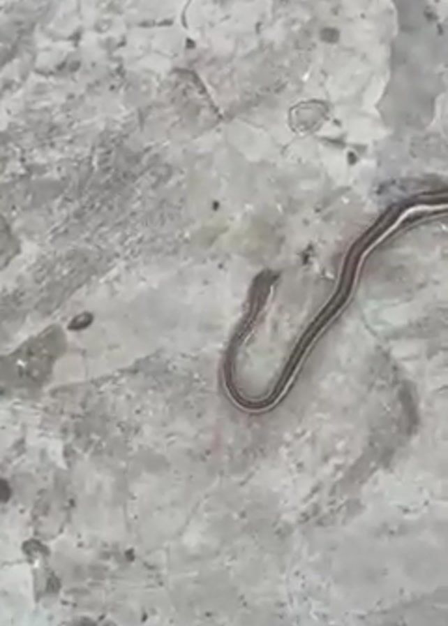 snake with a brownish-tan body and two thin yellow stripes running the length of its body. It's lying on a grey, concrete surface with cracks and some debris scattered around. The snake is mostly still, but it can be seen slightly moving and repositioning itself.