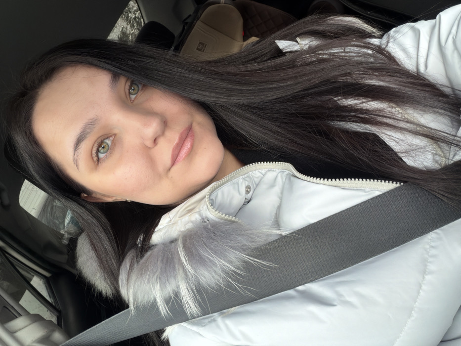 A close-up image depicts a female subject seated inside a vehicle, located in Mozhga, Russia. The subject has long, dark brown hair, fair skin, and light green eyes. She is wearing a light gray or off-white quilted winter jacket featuring a prominent light gray fur trim around the collar. The jacket has a visible zipper running down the front and snap buttons near the collar. A dark gray fabric car seatbelt is diagonally secured across her chest, from her left shoulder to her right hip area. Her head is slightly tilted, and her gaze is directed towards the camera. The vehicle's interior is partially visible behind her, including a portion of a tan-colored child's car seat in the rear and a blurred exterior view through a window, suggesting overcast conditions or a snowy environment.