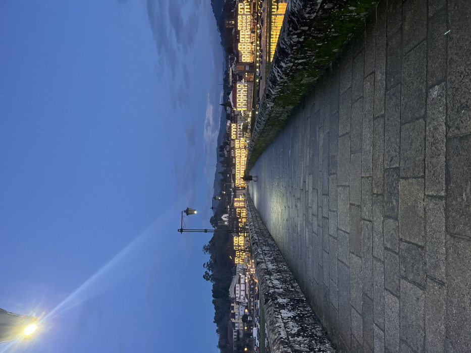 A paved walkway lined with a mossy stone railing stretches into the distance. A distant figure walks along the path, illuminated by reflected light. Buildings with brightly lit windows flank the walkway, extending along a body of water. The sky is a deep twilight blue, accented by streetlights. The image is shot at a low angle, looking down the walkway with a slight tilt.