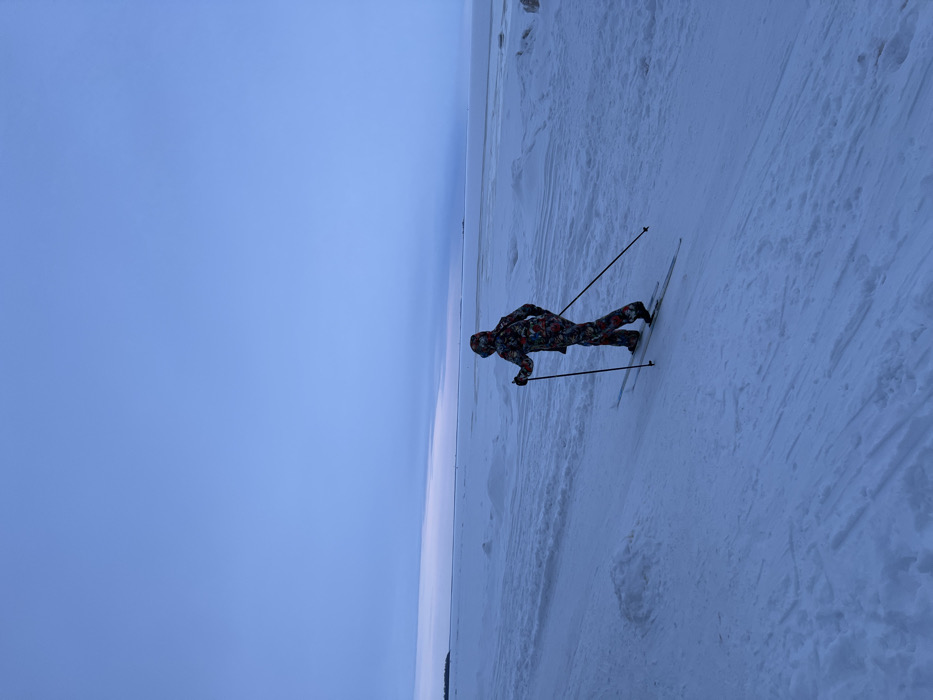 A skier in a colorful patterned suit skis across a snow-covered field. The person leans forward, planting ski poles in the snow. A flat, horizon line separates the snow-covered area from a pale blue sky with soft, wispy clouds. The image is rotated 90 degrees counterclockwise, with the sky on the left and the snowfield on the right. The ground appears slightly uneven with faint shadows and grooves.