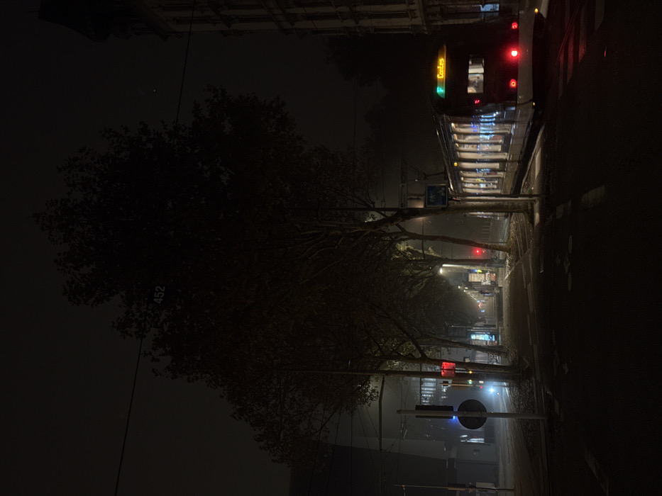 A nighttime cityscape view shows a street lined with trees. Fog obscures details. A tram with illuminated windows and tail lights is visible on the right. Street lights illuminate the foggy street. A street sign with the number "452" is visible attached to a tree. A building can be seen on the left. A traffic light with blue and red lights is visible in the distance.