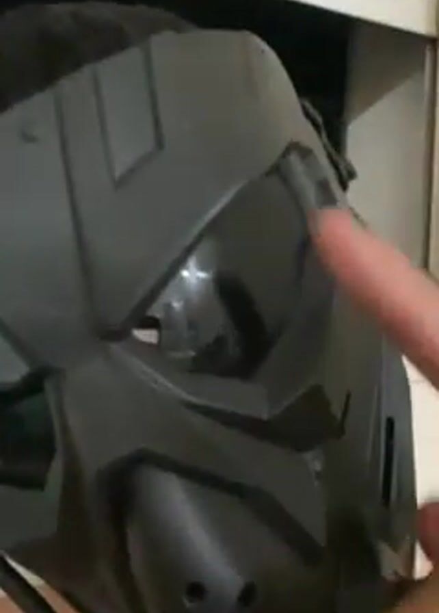 A person wearing a black futuristic-looking mask is shown from the chest up. The mask has eye coverings. The person’s index finger touches the side of the mask. The person is facing the camera and the video is taken indoors. The background includes what appears to be a closed blind.