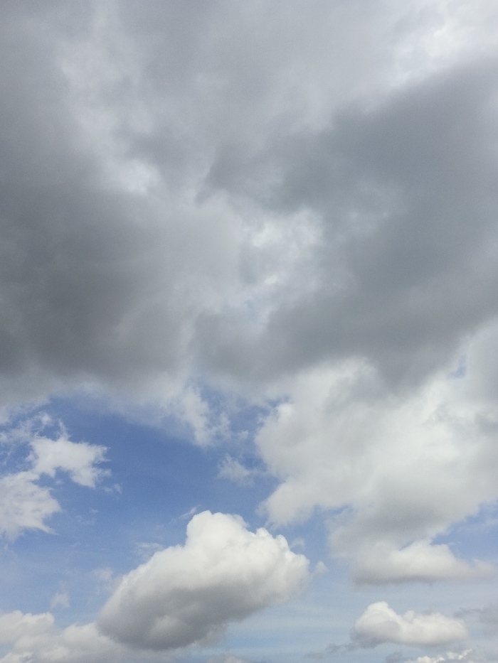 The image displays an overhead view of the sky above Ngọc Tụ, Vietnam. The upper and left portions of the frame are dominated by dense, dark grey overcast clouds. Towards the lower-middle and right-hand side, patches of clear blue sky are visible, interspersed with bright white, puffy cumulus clouds of varying sizes. No people, specific objects (other than clouds), actions, or interactions are present. The environment is atmospheric, with mixed cloud cover suggesting transitioning weather conditions.