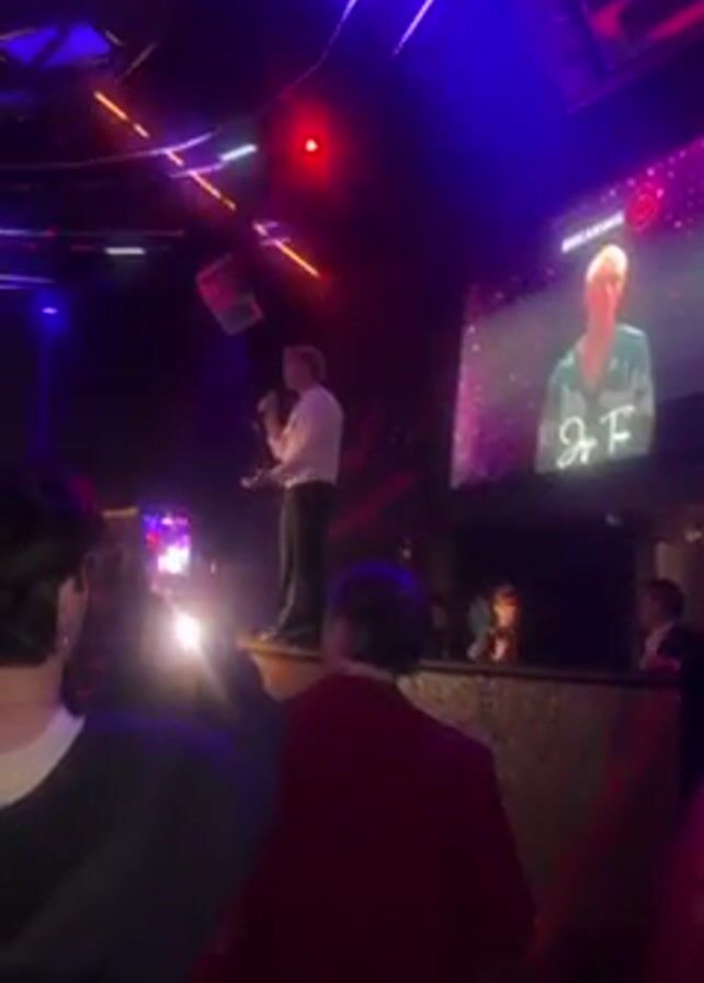 person on a small stage in a dark nightclub, holding a microphone. People in the audience are facing the stage, with some holding up phones to record. Overhead are colored lights and a large screen displaying a photo of the speaker with the name "J.T." written beneath it.