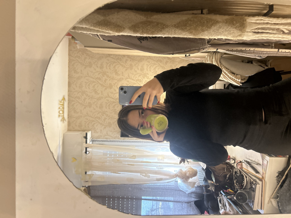 A female individual is depicted in a mirror selfie taken indoors in Schiltigheim, France