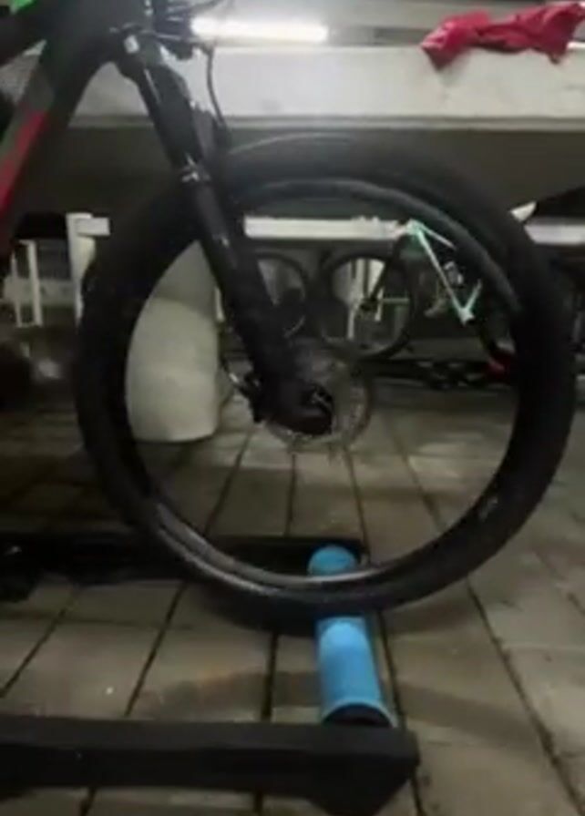 front wheel of a mountain bike resting on a roller. The wheel spins slowly, causing the roller to turn as well. The bike is stationary. Other bikes can be seen in the background. The scene takes place on a tiled surface, likely an outdoor or semi-outdoor area like a garage or covered parking.