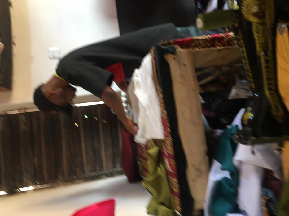 Inside a workshop or tailoring space in Jos, Nigeria, a dark-skinned male wearing a black short-sleeved t-shirt with a red accent and a black baseball cap is positioned over a wooden workbench
