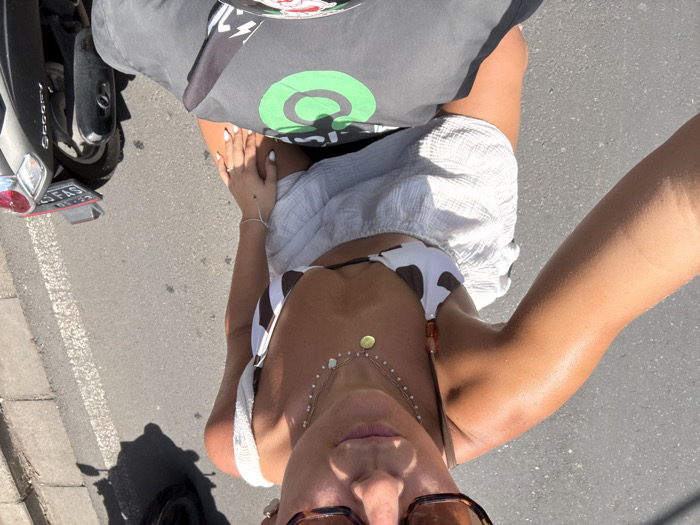 - "A high-angle, first-person selfie captures a tanned female subject on a scooter on an asphalt road in Pecatu, Indonesia, under bright sunlight" by FM-CYJaF3, licensed under CC BY 4.0