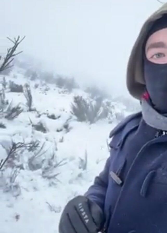 A person dressed in winter clothing stands in a snowy landscape