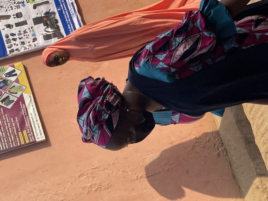 Two women, likely in West Africa, stand side-by-side. One wears a peach-colored headscarf that covers their head and neck completely, while the other sports a headwrap of blue, purple, and white patterned fabric with a dark navy blue shirt and a silver necklace. They stand near a peach-colored wall with two signs attached. The signs advertise a business selling a variety of clothing items and school supplies. The image is shot in a bright, sunny outdoor setting.