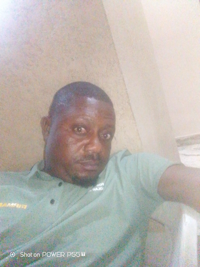 An adult man poses for a selfie. He has closely cropped dark hair and a mustache. He wears a light green collared shirt with printed lettering on the left breast and sleeve. The background features light beige walls with white trim and a hint of marble flooring. The image has a watermark at the bottom attributing the shot to "POWER P55T".