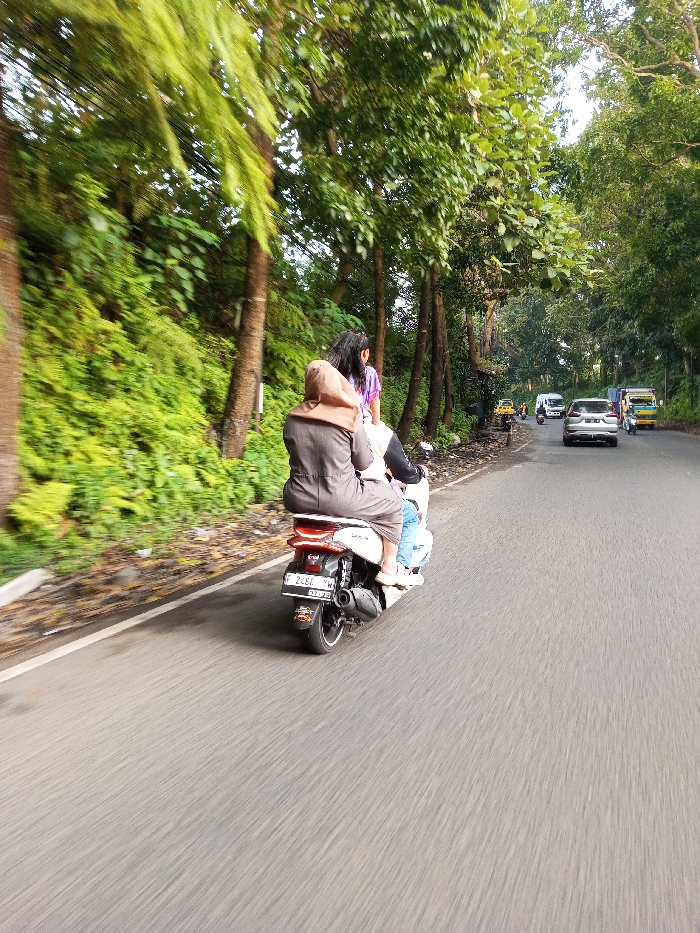 A street scene in Bagochen Boolingpang Ueling, Bhutan, shows three individuals riding a white scooter on a paved road. The scooter is in motion, evidenced by motion blur on the road surface. The front rider, mostly obscured, wears a light-colored top with dark sleeves. Directly behind is a second rider wearing a brown hijab and a dark-colored long dress. The third rider, positioned at the rear, has long dark hair and wears a purple and white striped top. The white scooter features a red taillight and displays a license plate marked "F 2456 MW." A white solid line delineates the left edge of the road. To the left, a dense green foliage embankment, including ferns and trees with exposed trunks, lines the roadside. In the background, on the opposing lane of traffic, a silver SUV, a white van or truck, and a yellow and blue three-wheeled vehicle are visible. The road extends into the distance, bordered by trees on both sides, under natural daylight.