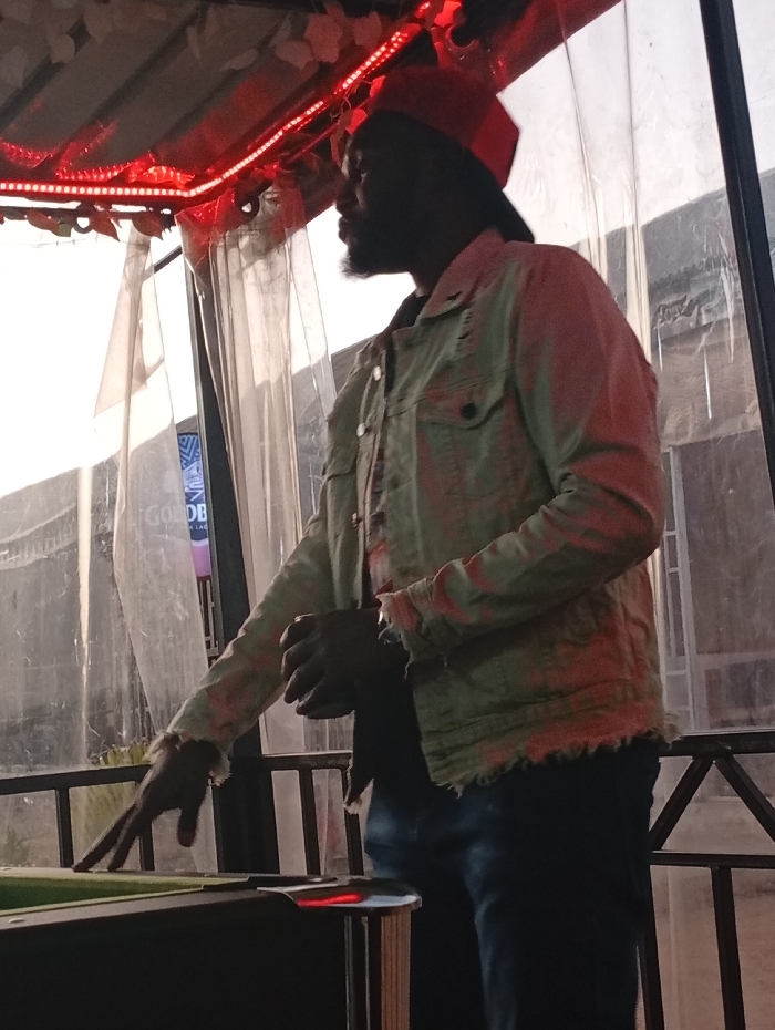 A man with a beard and red hat is playing pool. He wears a light green denim jacket and dark blue jeans. Red lights illuminate the ceiling above him. He stands beside the pool table, with his left hand resting on the edge. The background includes translucent plastic sheeting and a fence.