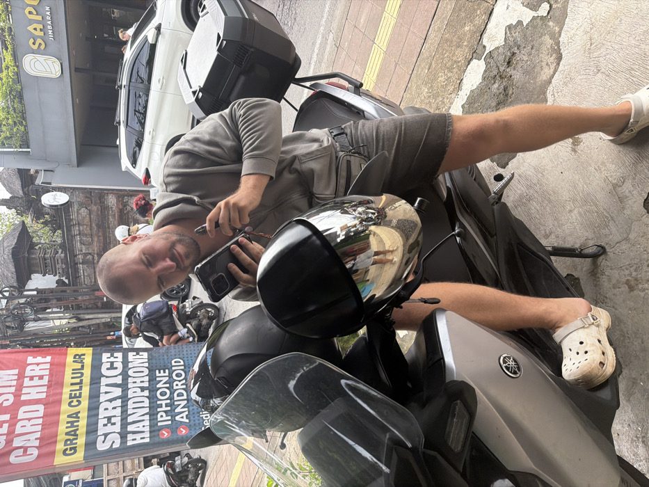A man with a shaved head, wearing a gray hoodie and shorts, sits on a motorcycle. He's looking at the camera and holding a phone and vape pen. A shiny helmet sits on the bike's handlebars. A sign advertising phone services is visible in the background. Parked cars and a building with the name "SAPO" are also visible. The man is wearing off-white Crocs. The motorcycle is silver and black, bearing a Yamaha emblem.