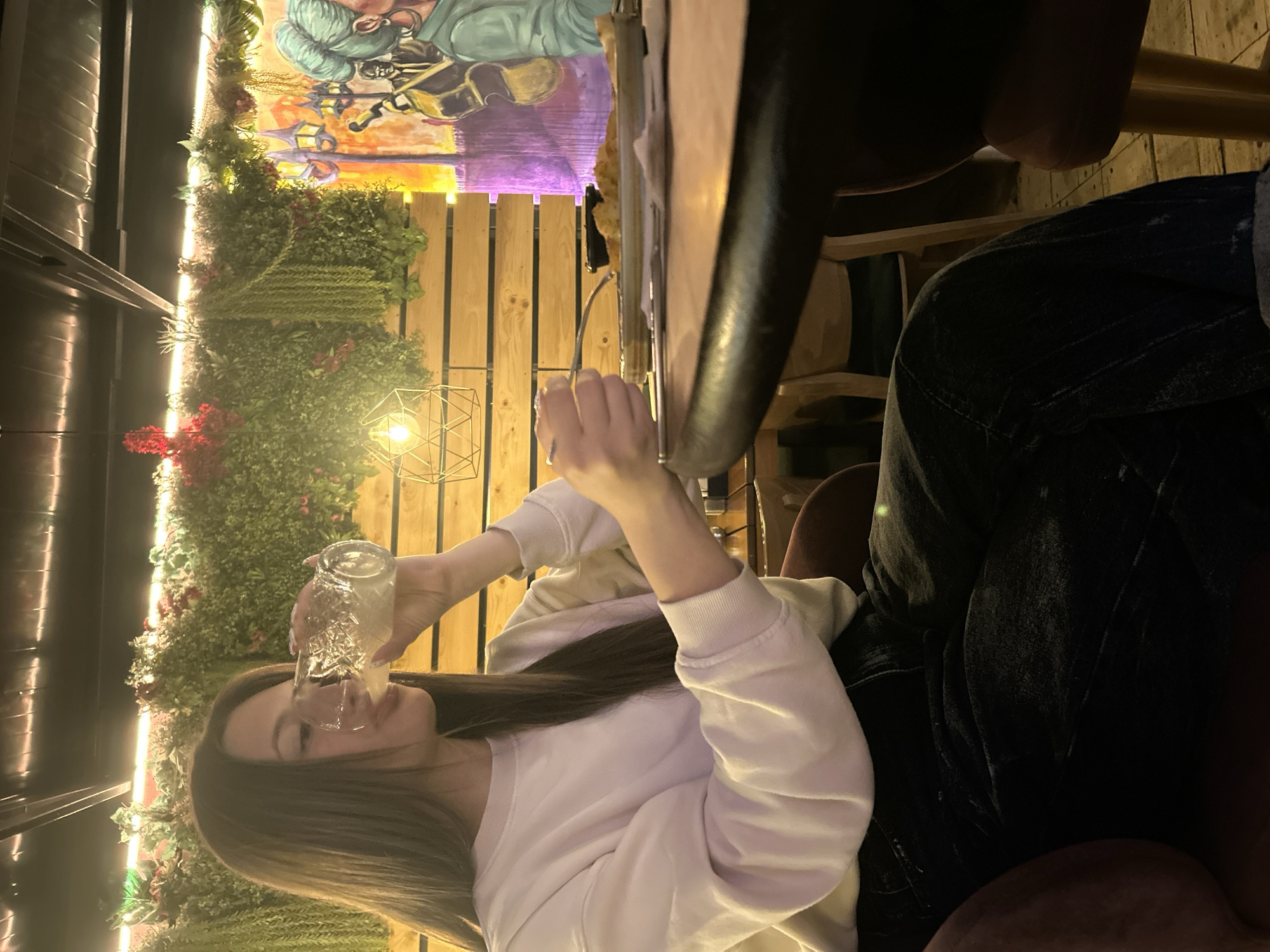 A woman is drinking from a textured glass in an indoor setting. The background includes an indoor vertical garden with various green plants and red flowers, illuminated by a light fixture. A mural is also visible in the background. The woman is wearing a white sweatshirt and dark jeans. The scene is possibly located in Pernik, Bulgaria.