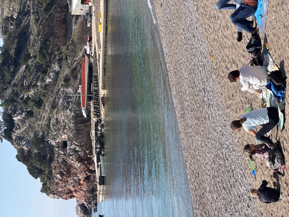 The image displays a coastal scene on a clear, sunny day in Miljevci, Montenegro. In the foreground, a pebbly beach extends across the lower portion of the frame. Five individuals are present on the sand. From left to right: a child in dark attire sits facing right; a second child in a patterned top sits facing left, interacting with a backpack near a woman in a light blue top and dark pants, who is seated on a patterned blanket and looking towards the children. To her right, an adult in a light-colored top and pants sits on a light blanket, facing the water. On the far right, partially visible, are the legs of an individual wearing blue jeans and lying on a blue blanket. Scattered plastic beach toys are visible on the sand. The midground features a calm bay with clear, blue-green water. A concrete pier extends from the left, with a small white boat moored. To the right, a concrete embankment displays the painted white text "HABANA CLUB," with smaller, partially legible text beneath. On the land behind the embankment, a large red and white boat is dry-docked, alongside other smaller vessels, a white building, and a dark vehicle. The background is dominated by a large, rocky hill, partially covered with sparse green vegetation. The rock formations on the left are distinctly reddish-brown and layered. A dark, rectangular opening is visible within the hill's face. The sky above is clear and light blue.