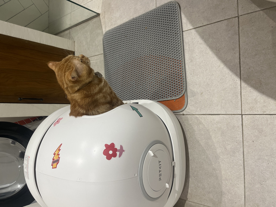 - "An orange tabby cat sits inside a white, rounded PetKit litter box" by FM-ZGFfb2, licensed under CC BY 4.0