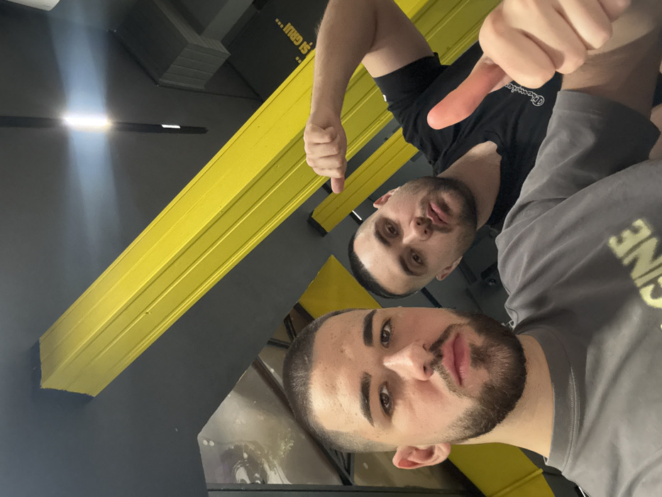 Two young adult males are depicted in a selfie taken indoors at a commercial establishment in Constanța, Romania