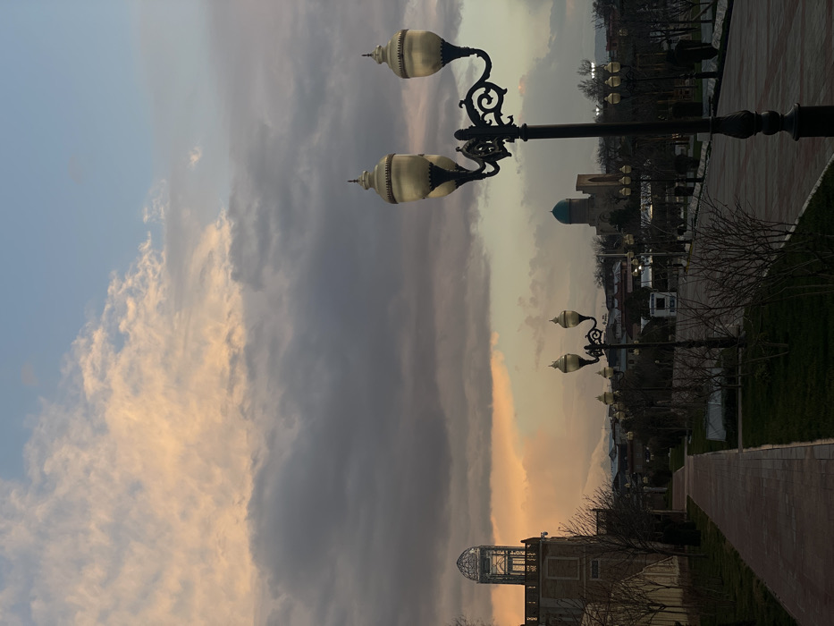 This image depicts a paved park area in Samarkand City, Uzbekistan, under a cloudy sky at either dawn or dusk