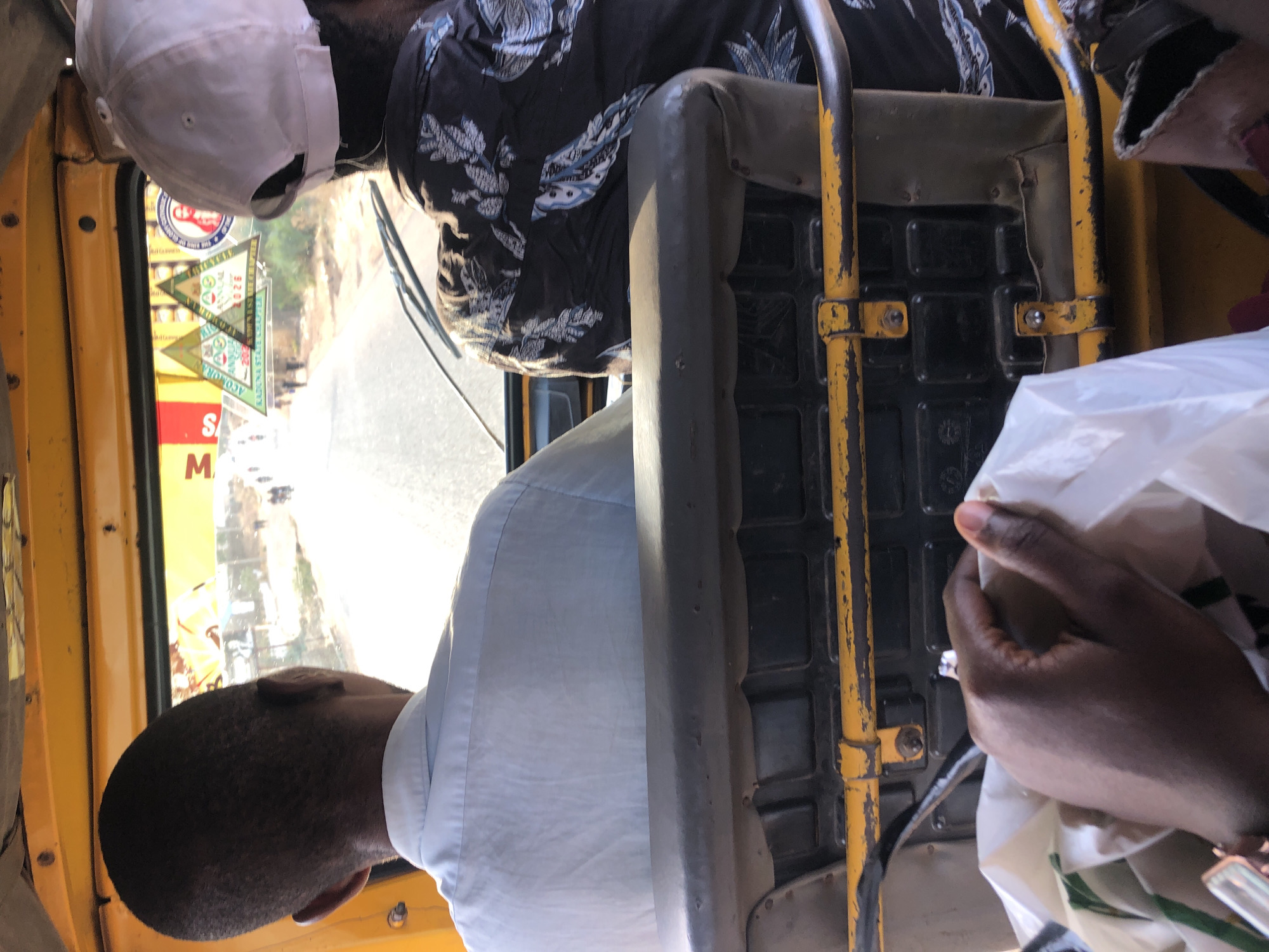 The image depicts a forensic scene from the interior of a yellow commercial tricycle (keke napep) in transit within Sabon Gari, Nassarawa, Nigeria. The perspective is from a rear passenger, looking forward over the shoulders of two individuals seated in the row ahead. In the immediate foreground, a dark-skinned hand holds a white plastic bag; a light-colored watch or bracelet is visible on the wrist. Directly in front of the observer is a dark-colored, worn seat back, likely composed of a padded top edge and a rigid, dark, possibly plastic or metal, lower section. Below this seat, yellow metal frame bars, showing chipped paint and wear, are visible. To the far right, a brown, possibly leather or canvas, bag is partially visible near the floor. Two male passengers occupy the seat in front. The passenger on the left has short, dark hair and wears a light blue collared shirt, seen from behind. The passenger on the right wears a dark-patterned shirt with white and light blue floral or feather designs and a white baseball cap worn backward. Beyond the passengers, the vehicle's windshield is visible, displaying several stickers. These include two green triangular stickers with "ACORAN ANNUAL 2026" text, one explicitly stating "KADUNA STATE NIGERIA," and a circular sticker depicting a reddish religious figure, possibly Jesus Christ. A red and white sticker with the letter "M" is partially visible to the left. Wiper blades are discernible at the base of the windshield. Outside the vehicle, a dusty, unpaved road stretches into the distance under bright daylight. Several indistinct human figures are walking or standing along the road. Sparse, dry-looking vegetation and distant structures line the road, suggesting an urban or semi-urban environment. The overall scene is one of daily transport in a Nigerian city.