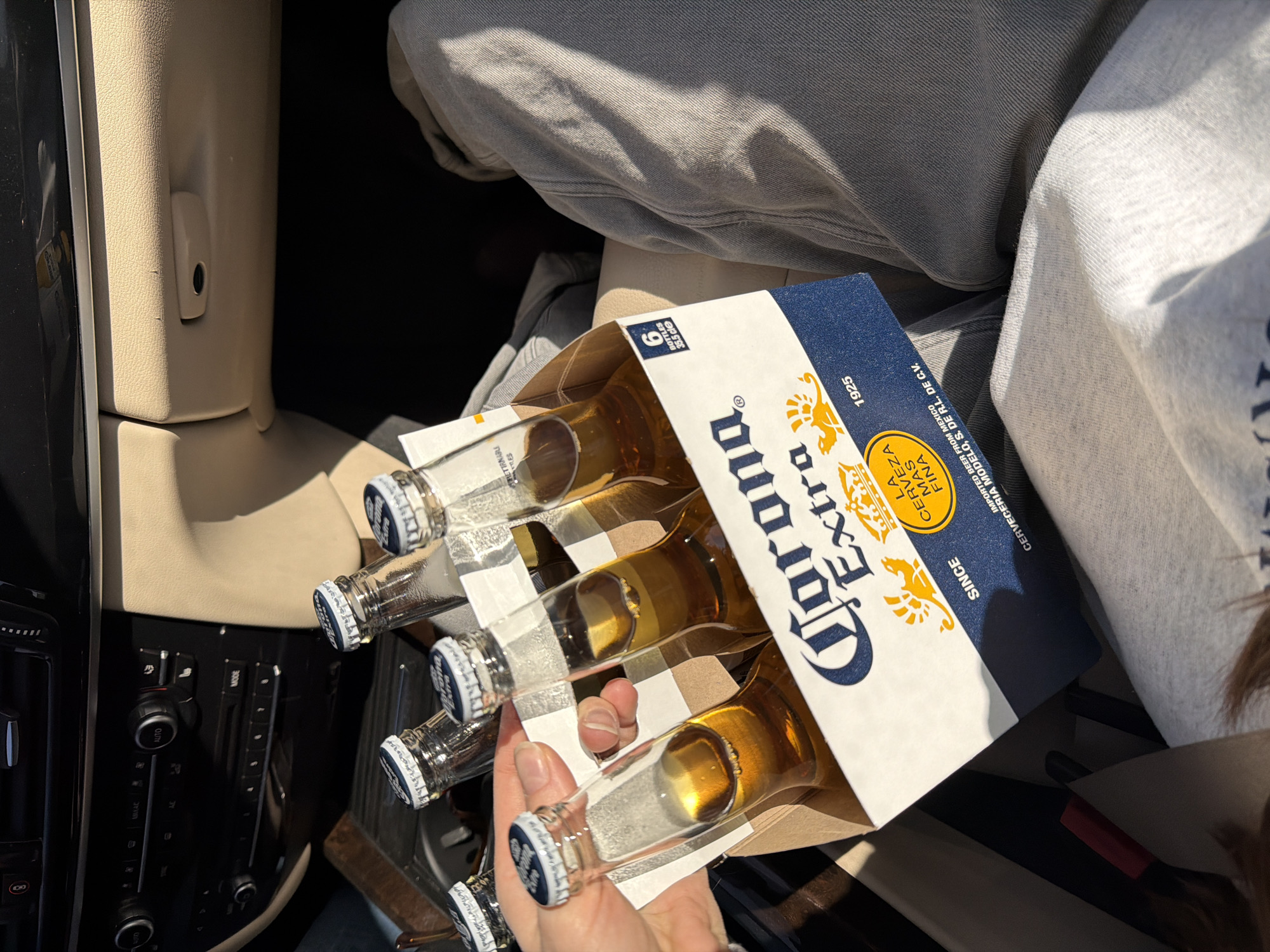 six-pack of Corona Extra beer bottles in a car