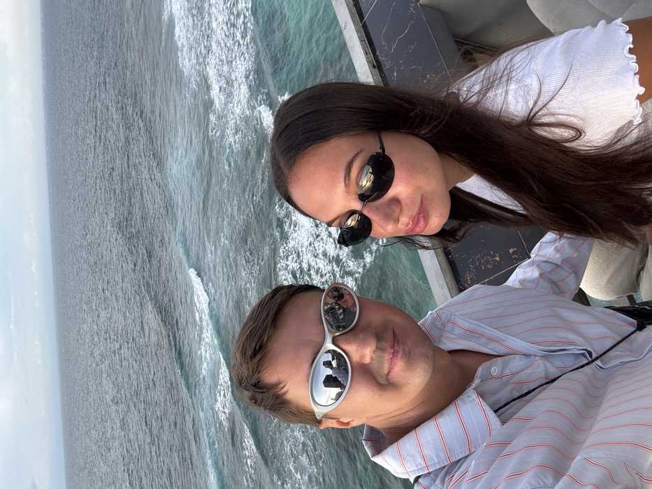 An elevated, outdoor wide-angle shot captures two individuals against a coastal backdrop in Uluwatu, Indonesia. On the left, a male subject with short brown hair wears a light-colored, red-striped button-down shirt and silver, reflective, futuristic-style sunglasses that show clear reflections of white buildings. He looks directly at the camera with a slight smile. A black cord hangs from his neck. To his right and slightly behind, a female subject with long dark hair wears a white ribbed t-shirt with ruffled sleeves and dark, oval-shaped sunglasses. She looks slightly to her right, away from the camera, with a subtle pout. Behind the subjects, the vast Indian Ocean displays multiple parallel waves with white foam crests, indicating currents or surf activity, and a discernible turquoise hue closer to the foreground fading to darker blue further out. The horizon separates the ocean from a partly cloudy, light grey and blue sky. In the lower right, a dark, flat-topped barrier or railing separates the individuals from the ocean below. A light-colored cushion, likely part of outdoor seating, is partially visible behind the female subject. The scene depicts two people posing in an elevated coastal setting, possibly a resort balcony or viewing terrace.