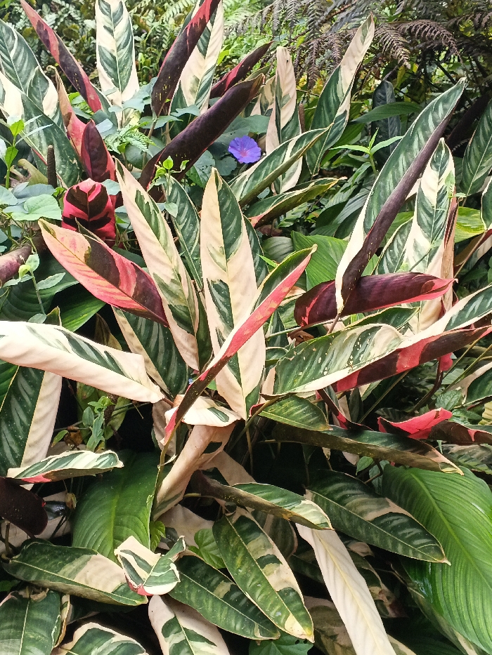 A dense grouping of strikingly patterned leaves dominates the image. Most leaves are striped with shades of green and cream, accented with red and maroon markings. Long, pointed leaves rise vertically, creating a lush, layered effect. Amidst the foliage, a single violet flower offers a small contrasting focal point. The overall impression is one of vibrant, exotic vegetation.