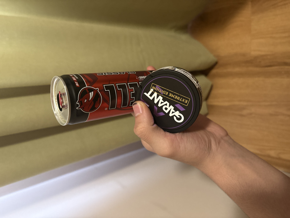 In an indoor setting in Plovdiv, Bulgaria, a human left hand with light skin tone and short nails holds two consumer items. The hand grasps a red and black "HELL CLASSIC" energy drink can, which is open at the top, revealing a red pull tab. Simultaneously, the hand holds a black circular container labeled "GARANT EXTREME EDITION" in purple and yellow text, consistent with a nicotine pouch product. The background consists of a light-colored curtain or drapery on the right and a plain white wall on the left. A light brown wooden floor is visible in the lower portion of the frame.