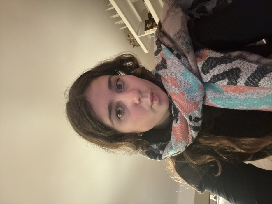 A young woman with brown hair and eyes purses her lips towards the camera. She wears a multicolored scarf with hues of gray, teal, and coral. A black shirt is also visible. The background includes a plain white wall and a shelf with items on it, suggesting an indoor setting. The photo is rotated, tilting the subject and background to the side.