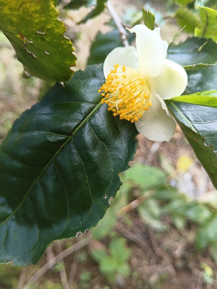 A close-up highlights a single white camellia flower with a dense cluster of bright yellow stamens. The flower emerges from a dark green, glossy leaf with slightly jagged edges, positioned prominently in the foreground. Additional leaves, some showing signs of insect damage, frame the flower. A blurry background of foliage and ground hints at a natural outdoor setting.