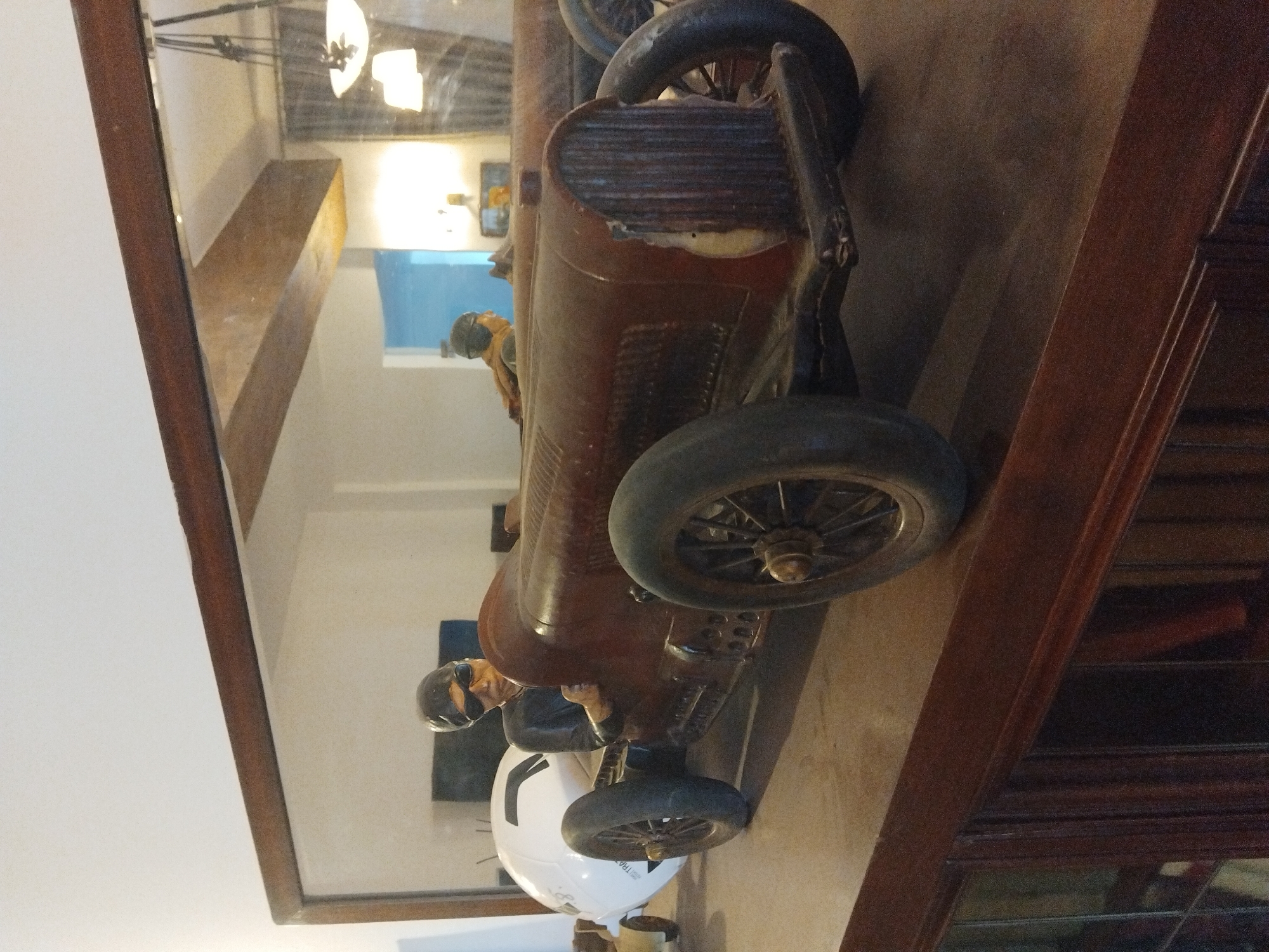 The image depicts a display of a vintage-style racing car model with two driver figures, likely indoors, potentially in a museum or private collection setting