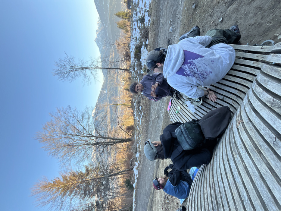 Four individuals are depicted on a hillside overlooking the city of Innsbruck, Austria, with snow-capped mountains under a clear blue sky. The ground consists of bare earth, dry vegetation, and patches of melting snow. A large, curved, weathered wooden slatted bench occupies the foreground and midground. On the left, a female wearing a dark vest and goggles, sits on a blue and white striped mat, smiling towards the center of the group. To her right, a male in a dark hooded top with a dark green cap and goggles sits on the bench, facing away from the camera. In the center, a male with long dark hair, wearing a purple hooded sweatshirt, holds a small, rolled item to his mouth. To his right, another male in a grey hooded sweatshirt with a purple mountain graphic on the back sits on the bench, facing away from the camera with goggles on his head. Several small items, including papers and containers, are present on the bench surface.