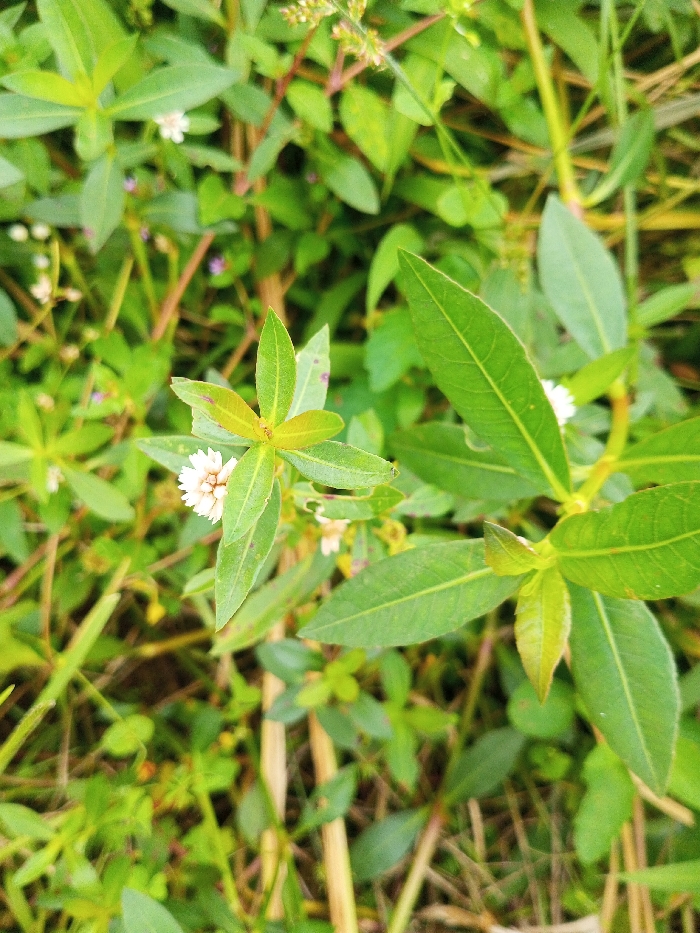 The image displays a close-up, vertical perspective of dense natural vegetation in Vieng Phouka, Laos. The central focus is an herbaceous plant exhibiting multiple light green, ovate leaves, approximately 2-4 cm in length, arranged radially from a central stem. A single white, globular inflorescence, approximately 1 cm in diameter, is visible on a short stalk originating from the left side of the primary plant. Surrounding the main subject, the environment consists of various shades of green foliage, including broad leaves and narrower grass blades, with some elements appearing out of focus. Several other smaller white and faint purple flower heads are scattered throughout the background. Minimal dried, light brown plant stalks are discernible among the green growth. The scene is illuminated by ambient daylight. No individuals, animals, or man-made objects are present.