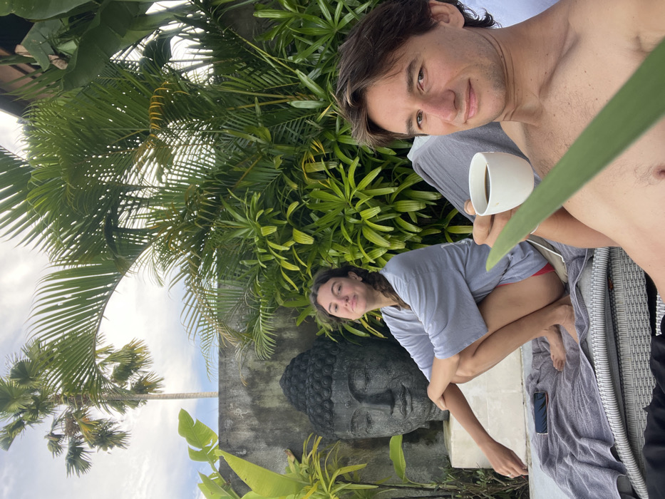 Two people pose for a photo in a lush, tropical setting. One man is shirtless, holding a white cup, with a relaxed smile. A woman sits beside him, also smiling, with a large stone Buddha head visible behind her. The scene includes palm trees, green foliage, and a grey chaise lounge with a towel. A mobile phone sits on the chaise lounge near the woman. The overall ambiance suggests a relaxed, vacation-like atmosphere.