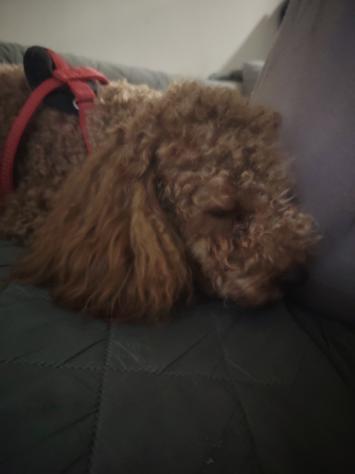 - "In Izvor, Bulgaria, an indoor scene depicts a light brown, curly-coated dog resting on a dark green quilted fabric surface" by FM-cZ49r1, licensed under CC BY 4.0