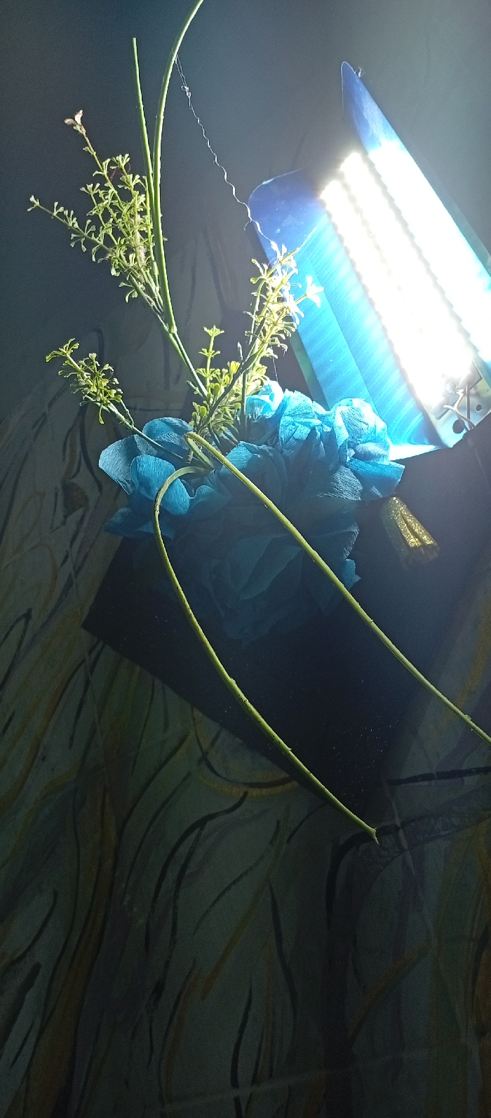 A bouquet of blue paper flowers and green stems is positioned near a bright light. Some stems are bare, while others bear small green leaves and tiny white buds. The bouquet sits atop a dark, reflective surface, which rests on a textured, patterned fabric. A loose, spiral-shaped thread hangs in the air near the flowers. The light source casts a blue hue on the scene.