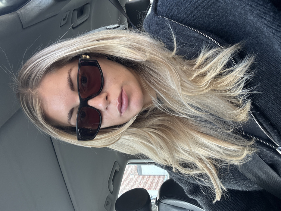 A single female individual is depicted in a medium close-up, seated within the interior of a vehicle, positioned in Wattrelos, France. The subject has long, light blonde hair with visible darker roots, styled with a side part. She wears large, rectangular dark-framed sunglasses with dark lenses, obscuring her eyes. A golden-colored emblem is visible on the right temple of the sunglasses. Her lips appear to be coated with a light-colored cosmetic or are naturally pigmented. She is wearing a dark, possibly charcoal grey, textured zip-up jacket over a dark undergarment, with a silver-toned zipper pull visible. A dark seatbelt extends diagonally across her chest and shoulder. The vehicle's interior features a light grey headliner. A dark headrest is visible to the left, and a dark grab handle is affixed above the rear passenger window frame. Through the passenger side window, a segment of a red-brown brick building with light-colored window features is discernible in the background. The lighting suggests an outdoor environment during daylight hours. The individual is oriented directly towards the camera, indicating a posed photograph or selfie.